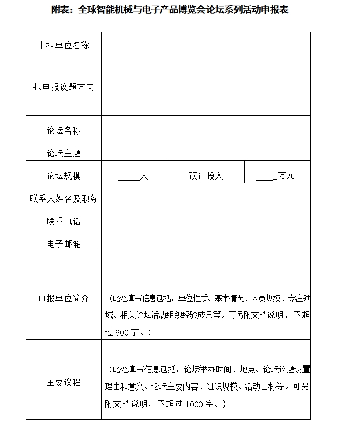 应紧扣智能机械与电子产品领域热点话题、包括但不限于人工智能、智能通信、无人机产品及技术、智能出行、科技创新和应用创新等板块,精心进行选题策划,促进技术交流、产业合作等。原则上每个申报主体聚焦一个主题申报一个论坛,如一个主题有多个申报主体,组委会将根据申报方案择优选择。