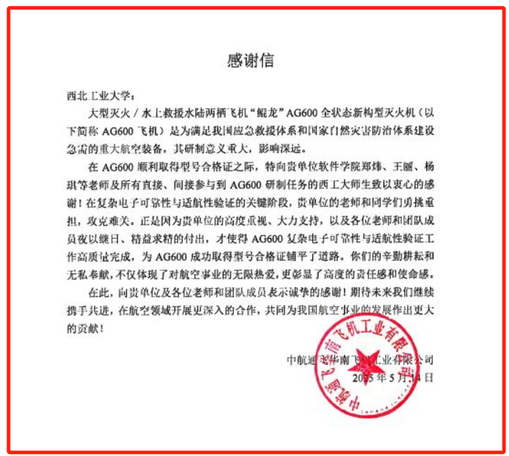 面对航空系统安全性要求严苛、适航验证时间紧迫等挑战,团队以“航空报国”为信念,与中航通飞、中航615所、中航114所、中航618所等单位通力合作,历时一年半攻坚克难,最终高质量完成任务。中航通飞在信中特别赞扬团队师生“你们的辛勤耕耘和无私奉献,不仅体现了对航空事业的无限热爱,更影显了高度的责任感和使命感”。